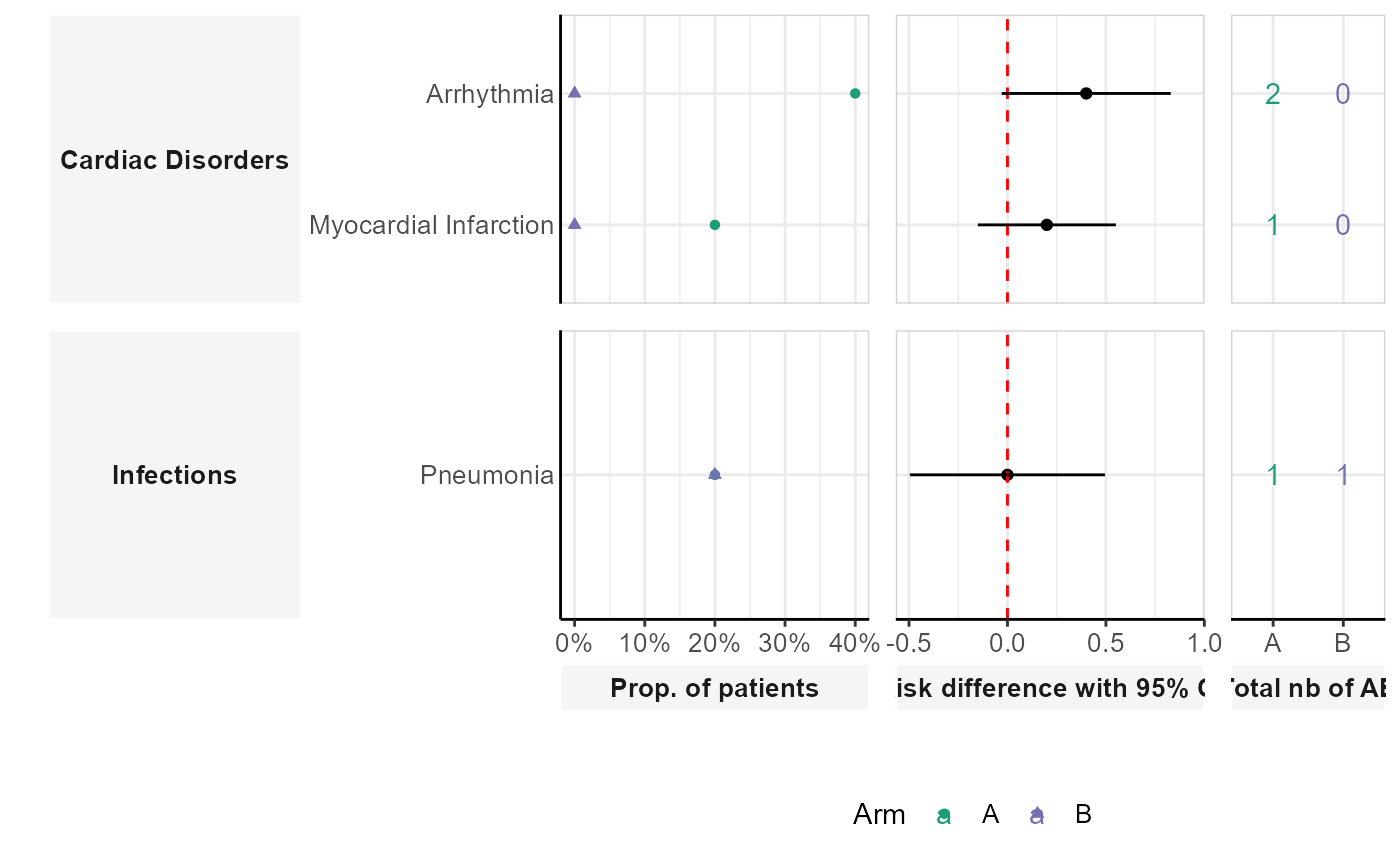 This function creates a dumbbell plot comparing the occurrence of adverse events across different patient groups. The plot includes the total number of adverse events, the proportion of patients affected, and the risk difference with confidence intervals.